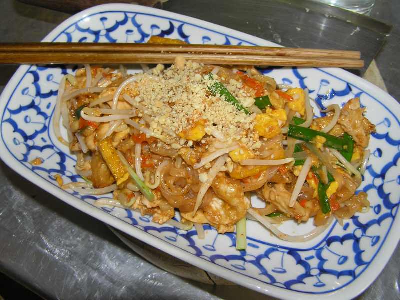 und ich habe mir vorgenommen hier täglich, passend zum thema ein gericht, frucht, gemüsesorte oder ähnliches vom thailandurlaub zu präsentieren.heute (im open-air-kochkurs selbst gekocht und deswegen mit originalrezept)phat thai:pro person:50g breite reisnudeln50g in schmale streifen geschnittenes hähnchenfleisch oder garnelen20g (gelber) tofu (leicht zerbröselt)10g frühlingszwiebel oder knoblauchgrün, in 3cm lange stücke geschnitten30g sprossen oder kohl1 kleine gehackte knoblauchzehe1 ei2 esslöffel öl2 esslöffel dicke austernsoße2 esslöffel fischsoße1 teelöffel zucker1/4 tasse wasserchilipulver, getrocknete minishrimps (kann man auch weglassen), gehackte erdnüsse, limonensaftwok oder pfanne mit öl stark erhitzen (in folgender reihenfolge die zutaten nacheinander dazu geben)knoblauch und tofu in öl anbraten, hähnchen hinzu und von allen seiten kurz anbraten, glasnudeln und wasser dazu, austern- und fischsoße, sowie zucker dazu, verrührenein ei hineinschlagen, alles schnell vermengensprossen und frühlingszwiebel dazu. chilipulver, gehackte erdnüsse, limonensaft und shrimps nach geschmack zugeben.fertig. das ganze dauert etwa 5 minuten und wird (weil nudeln) mit stäbchen gegessen.das ganze wird nach fantasie variiert mit verschiedenem fleisch oder gemüse, so dass das rezept nur eine variante davon darstellt.