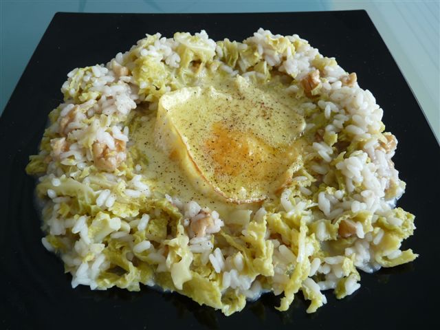 es gab:BlattsalatCamembert aus dem Ofen in einem Wirzrisotto mit Walnüssen