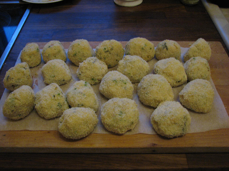 danke für diese tolle idee!Bei mir gibts gleich abgewandelte Arancini. Inspiriert hat mich dieses Rezept.Ich hatte zwar jede Menge verkochten Reis vom Vortag da der verarbeitet werden musste, dafür einige Zutaten aus dem Rezept nicht.Meine Variante geht deshalb folgendermaßen:sehr weich gekochten Reis (normalen) mit geriebenem Käse (Tillsitter, Appenzeller und Pecorino - alles was weg muss), gehackter Petersilie, Salz und Pfeffer mischen, 1 Ei unterrühren.Für die Füllung:klein gehackten Spinat (TK-Ware, gut ausgedrückt)1 mittlere Zwiebel1 Knoblachzeheeinige getrocknete Tomaten2 El Frischkäse1 Schuß Weißwein1 MozarellaZwiebel mit Knoblauch weich dünsten, mit Weißwein ablöschen und Flüssigkeit verdampfen lassen, gehackte getrocknete Tomaten (in Öl eingeweicht), Spinat, Frischkäse und klein gewürfelten Mozarella dazu, abschmecken.Aus Reispampe mit nassen Händen Klößchen formen, mit dem Finger ein Loch hineindrucken und wenige Füllung hinein geben. Anschließend Klößchen in Paniermehl wälzen (ohne vorher in Ei - das hatte ich nämlich auch nicht mehr).Dazu gibt es eine fruchtige Tomatensoße aus den eingefrorenen Reserven vom letzten Jahr. Ich bin mal gespannt wie es schmeckt - es duftet jedenfalls schon mal gut.Das Bild zeigt die Kugeln vor dem Braten