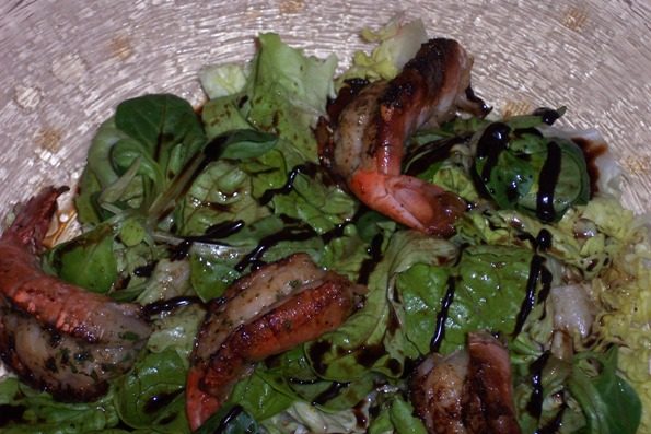 hier der nachtrag von gestern. gegrillte scampi auf salat. mit etwas zuviel balsamico gereicht :'(aber lecker und vor allem (hallo jayein ganz klein wenig fleisch gab es aber dennoch gestern abend. das bild liegt aber auf der anderen kamera - wird vielleicht noch nachgereicht.