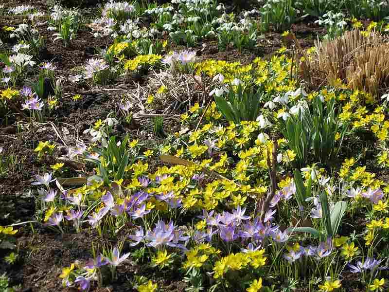 Meine Staudenrabatten sind bis 10 Meter lang und bis 8 Meter breit, da muss ich zur Pflege schon mittenrein. Außerdem sind die Flächen teilweise lückenlos mit Frühlingsblühern durchwebt. Da die Frühlingsblüher oft schon im Januar und unter Schnee treiben, komme ich mit dem Herbstdurchgang besser zurecht.