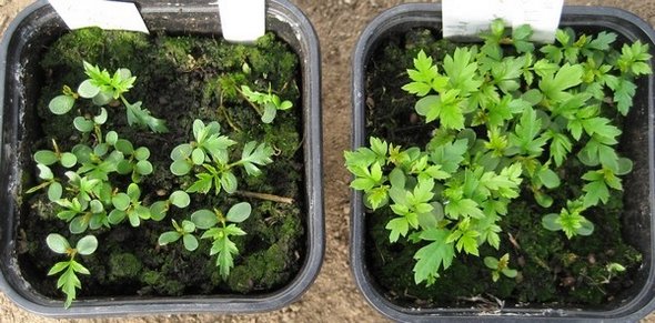 Neues von meine Sorbus-Sämlingen.Links im Bild die Sämlinge von den weißen Beeren und rechts die von den gelben Beeren. Die ersten "richtigen" Blättchen sind interessanterweise noch nicht vollständig gefiedert.Jetzt werde ich sie demnächst pikieren. Bis auf den S. commixta-Sämling, der ohnehin als einziger in seinem Topf aufgegangen ist.