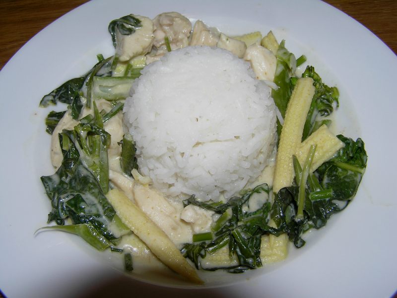 )grünes curry mit hühnchen, babymais und allerlei thailändischem blattgemüse
