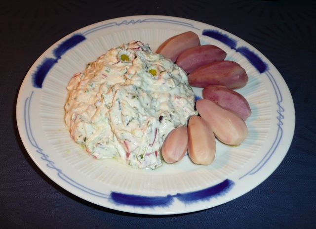 Kartoffeln (Rosalinde, die sich im winterkalten Keller wunderbar gehalten haben) mit frühlingshaftem Kräuter quark