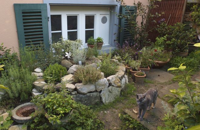 riesenweibs Fotos zeigen, was ich meine. Der Rasen. Neu angelegt ist das möglichwerweise etwas, das nicht ins Auge fällt, aber wie pflege ich diesen Rasen, der bis zu den Sockelsteinen der Spirale reicht? Alle Versuche in der Richtung, die ich kenne, haben besonders diesen Mangel, dass auf einen bestehenden Rasen etwas wie ein Steingarten aufgebaut wird, dass überhaupt nicht zu der fetten Wiese passt und von dieser dann in windeseile überwuchert wird. Wenigsten in Gärten, die sich Naturgärten nennen.Auf kleinstem Raum kann man Kräuter sehr viel besser unterbringen. Auch in Küchennähe. Ich verwende sehr erfolgreich Töpfe und Kübel.