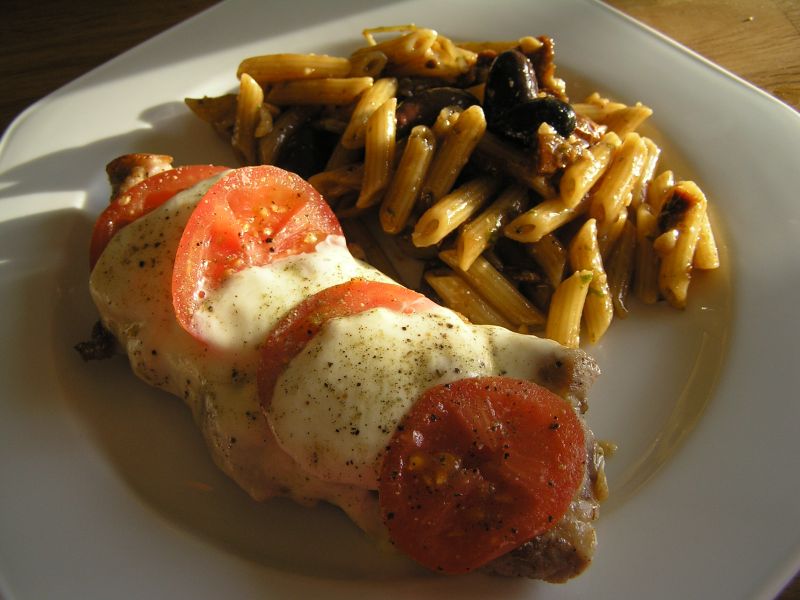 und heute schweinerückensteaks überbacken mit tomaten und mozzarella, dazu nudelsalat mit oliven, getrockneten tomaten und bärlauch.