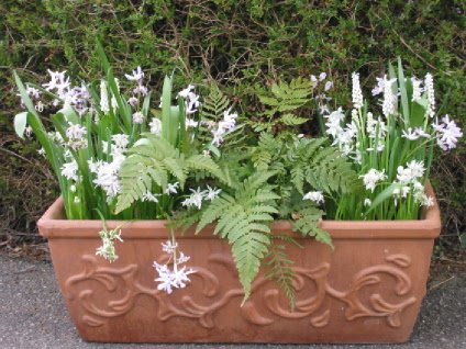 Weisse Scilla sibirica mit Scilla siehei / Chionodoxa"Pink Giant" und weissen Muscari, ausnahmsweise mal in einem Blumenkasten.