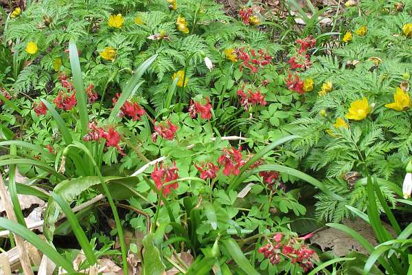 Ich habe hier ein Corydalis, das ich nicht mehr bestimmen kann (das Schild ist leider verloren gegangen). Ich habe es schon ein paar Jahre. Im März/April taucht es plötzlich auf, blüht üppig und verschwindet dann schnell wieder. An dem Standort ist es ausgesprochen trocken im Sommer, der Boden durch die Nadelstreu sauer und locker. Es scheint sich offenbar wohl zu fühlen und hat sich auch schon etwas in der Umgebung versamt. Kann mir jemand bei der Betimmung auf die Sprünge helfen?