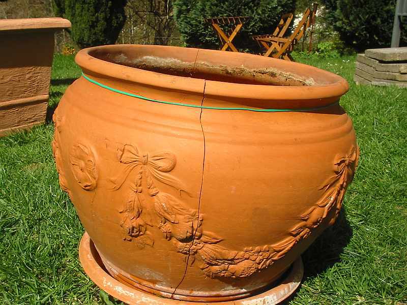 Ich hab einen Bericht über die Fernsehsendung wiedergefunden, hier steht unten als Tipp die Alternative mit dem Fliesenkleber erwähnt. In der Sendung erzählte der Mann das auch genau so, es geht also wirklich um Fliesenkleber, nicht, dass das ein "Übersetzungsfehler" wäre. Der Flexkleber, den ich habe, härtet in braun-grau aus, schon besser, als schneeweiß. Kleber könnte man doch vielleicht auch einfärben, mit zementgeeigneten Oxidfarben vielleicht, Eisenoxidrot oder ein orangener Ton müssten doch gehen, oder einfach die Naht mit etwas halbwegs wasserfestem überpinseln, kann man ja ab und an wiederholen, perfekt ist der Topf ja letzten Endes doch nicht mehr, das muss man dann als Patina abhaken. Es gibt auch braune Eddings, oder den Pelikan Malkasten, man könnte dann einfach etwas Mattlack drüberstreichen, oder Sockel- oder Fassadenfarbe....Uralte zerbrochene Kübel mit Patina finde ich auch mit rostigem Draht zusammengezurrt ganz attraktiv.