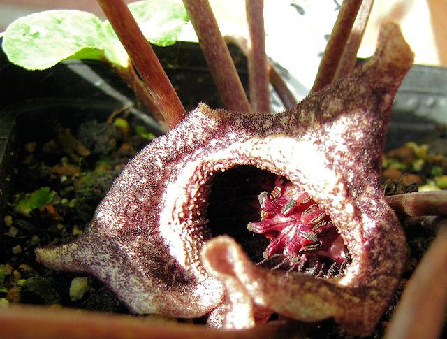 ah...asarum campaniflorum. zu der kann ich mittlerweile sagen, dass sie winterhart ist. draussen wächst sie aber elendiglich langsam. heuer habe ich beim emporwölben aus der nadelschicht meiner metasequoia sogar eine blüte zwischen den blättern entdeckt. allerdings eine empfindlichkeit zeigt sie ausgepflanzt. sobald auch nur ein hauch nachtfrost über die blätter streift, wenn sie mal angetrieben hat, ist es vorbei mit der herrlichkeit. ich hab's noch einigermaßen rechtzeitig bemerkt hoffe ich. nur ein sich entwickeltes blättchen, das schon etwas aus der nadelschutzschicht hervorgespitzt hatte, hat's erwischt.@ulrichzu deiner fällt mir nix ein...eine splendens ist das nicht oder?