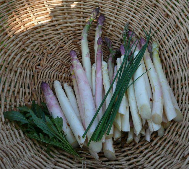 hoppla, stimmt ja: grünspargel, kerbel und ein paar primel- und hornveilchenblüten als deko. siehe hier. ;)und bärlauch und so knoblauchiges alliumblattwerk für den morgigen frühstücksquark.