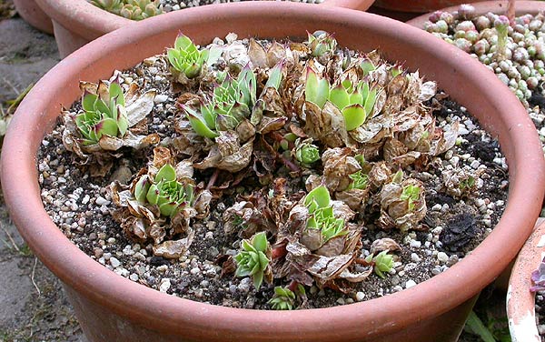 Ich habe im Mai mein Xerophytenbeet aufgelöst und sämtliche Pflanzen in Terrakottatöpfe umgepflanzt. Bis auf das unten abgebildete Sempervivum haben sich seitdem alle Pflanzen prächtig entwickelt. Weiß jemand, was hinter diesem Schadbild steckt?