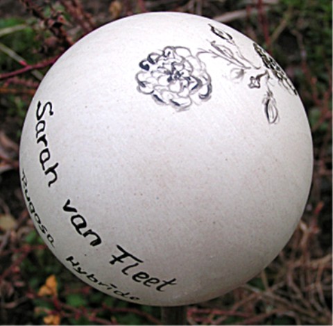Die Kugeln sind aber hübsch. Und die hast Du selbst getöpfert? Wie bekommst Du sie so schön rund. Eine gute Idee den Namen der Rose darauf zu schreiben. Die Schildchen gehen meistens nach einiger Zeit kaputt....wie kriegt man mehrere Bilder hierein??