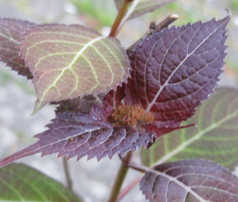 'Merveille Sanguine' ist eine tolle Hortensie. Hat den Winter und Spätfröste als mittlerweise 10 jahre alte Pflanze ungeschützt prima überstanden. Eine richtig dunkelrote Blütenfarbe nimmt sie allerdings nur an, wenn der PH-Wert nicht zu niedrig ist.'Ripple' kenne ich nur von Abbildungen.Weitere Sorten mir "richtig" rotem Laub(austrieb) sind 'Selina' und 'Love You Kiss'. Während die erste recht frostempfindlich ist, hat sich die zweite bei mir durchaus bewährt.Gespannt bin ich auf H. serrata 'Kyosumi' Sie wird das erste mal blühen.
