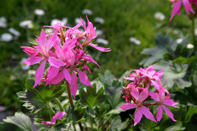 Pelargonium violareum hort. syn. Pelargonium tricolor syn. Pelargonium 'Splendide', Hybride zwischen P.tricolor X P. ovale, "dwarf shrubby plant" wie Phillps/Rix schreiben.Sollte also eher nicht so groß werden und breitbuschig wachsen, ein Exemplar das ich dieses Jahr sah war etwa 30 cm hoch und etw 40 breit.Die eine Elternform, P.tricolor stammt aus höheren Lagen in Südafrika und soll bis - 3° hart sein: "hardy to - 3°, perhaps less." Ebenfalls eine Pflanze aus "dry rocky slopes and mountain fynbos" ist P. ovale, zu deren Winterhärte nichts angegeben ist.Also: nicht hart bei uns, bis 0° kann man sie wohl draußen lassen, wenn mager und trocken. Habe meine auch neu und über Nacht abgedeckt, war mir nichts mit der Kühle, die für letzte Nacht offeriert wurde.Ansonsten sicher ein problemloses Pflänzchen und: wunderschön. In den blühenden Busch, der an einem Stand im BoGa (Bln.) zu sehen war habe ich mich augenblicklich unsterblich verliebt...Windanfällig? Glaube ich eher nicht, ist Gewöhnungssache, jedenfalls habe ich diese Beobachtung bei anderen Pelargonien gemacht.