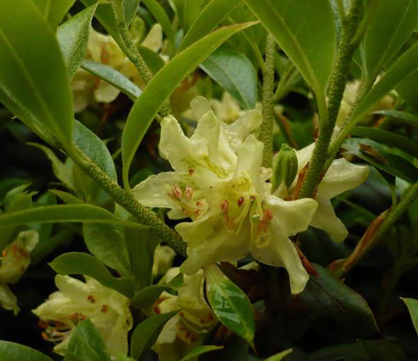 Rhodoendron ambiguum blüht hellgelb, die Blüte fällt im frischen Austrieb kaum auf.