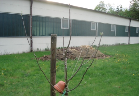 Ich weiß, daß man häufig die Selbstheilungskräfte gerade junger Bäume unterschätzt, nun ja ::)An den Fotos sieht man noch einen recht schwachen Ast unter der Wunde, wenn ich es richtig erkennen kann (auf dem Foto nach hinten wachsend).Evtl. kannst Du versuchen, diesen hochzubinden als neuen Leitast oder wenn er dazu zu stark ist über einer nach oben gerichteten Knospe zu schneiden.Habe häufig ie Erfahrung gemacht, daß gerade die Knospen nicht gern austreiben, die man gerne hätte (oft trotz Kreuzschitz drüber)...So hättest Du zumindest ein Reserveast.LG Lisa