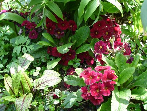 Bei meinem Gärtner gibt es in jedem Frühjahr ca. einen Monat lang die schönen buntern Primeln mit dunklen Blättern zu kaufen. Einerseits würde man sie als "Jessica-Form" bezeichnen können, aber von den Blüten her könnten es z.T. auch Cowichans sein. Da muss ich natürlich immer Nachschub besorgen und mittlerweile habe ich schon viele verschiedene Faben und Formen angesammelt, die großenteils nach dem Winter treu wieder kommen. Da diejenigen vom Vorjahr natürlich viel später blühen als die neu gekauften, habe ich immer eine ganz schönlange Primelsaison.(Ich habe immer noch nicht recherchiert, wie man mehrer Bilder in ein Post bekommt, bin momentan zu kribbelig, um es zu probieren, daher entschuldigt bitte, dass ich dauernd neue Posts mache).Hier eine Leuchtende in Rot und Rosa, die schon einige Jahre überlebt hat: