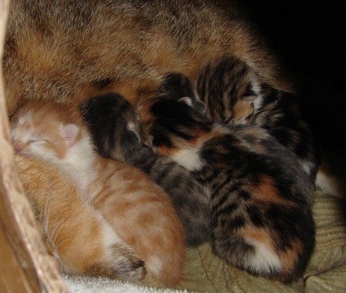 Es ist gar nicht leicht, ein paar gute Schnappschnüsse zu kriegen.Von 100 Aufnahmen taugen vielleicht zwei ein wenig was.Dadurch, dass ich mit Teleobjektiv in die stockdunkle Kiste mit Knips fotografiere, gibts sehr viele Schatten.Aber bald werden die kleinen ans Licht stapfen und alles erkunden, dann werd ich vielleicht gute Fotos machen können, aber dann hab ich dafür vermutlich keine Zeit, weil ich nur noch den kleinen Satansbraten hinterher-renne.Ja, ich hab wirklich schon alles versucht: Baldrian, Katzenminze, Katzengras, Katzenmilch, Wasser, etcpp. Die Mama interessiert sich definitiv nur für ihr Futter, das nimmt sie aber recht zuverlässig. Die Katzenmilch lässt sie stehen.Blaumeise, du hast ein wahres Wort gesprochen:In der Natur trennen Katzen auch keine Eier. Manchmal ist man wirklich ein bissl hysterisch mit unseren Tigern.Aber wenn ich dann unseren Kater beobachte, was der jetzt alles nicht anrührt, nur, weil er sein geliebtes Trockenfutter nicht mehr nehmen darf, dann wird mir schon Angst und Bang.Das allerallereinzigste, was er derzeit überhaupt nimmt, ist Putenfleisch.Wenn das mal nicht einseitig ist!Ach, ich vergass: Die Sprühsahne. Nimmt er ja auch noch. :-[Morgen fahr ich in den Fr---napf und hol mal diese Mini-Döschen und dann noch in Schlecker, das von Barbarea empfohlene Futter. Versuch macht kluch.