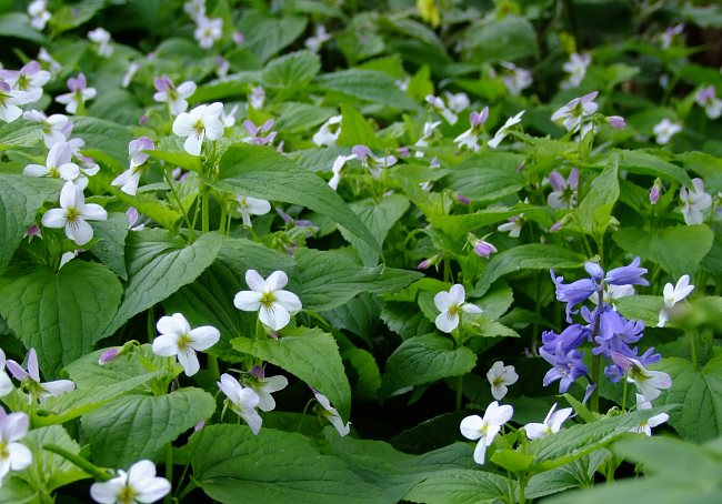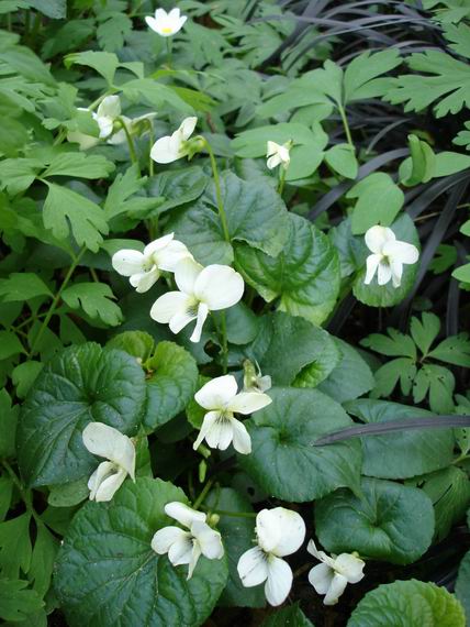 viola canadensis wäre eigentlich ein hübsches veilchen, große herzförmige blätter, die weißen blüten mit der feinen schlundzeichnung + dem lavendelrosa hauch auf der blütenrückseite. leider wuchert es + wird auch ziemlich hoch, macht dabei aber eine gute figur. hat ihren reiz in ecken, wo sie sich ausbreiten darf, aber ist mit vorsicht zu genießen. also nur mit deutlichen warnhinweis weitergeben.