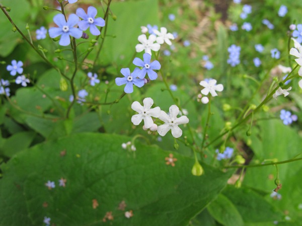 diese weiße Form finde ich sehr wertvoll. Fügt sich wesentlich besser ein als diese vergissmeinichtblaue Farbe. Mit der geht es mir wie zwerggarten mit diesen Scilla siberica.Und ein Stückchen weiter hat sich Brunnera 'Betty Bowring' ausgesät.