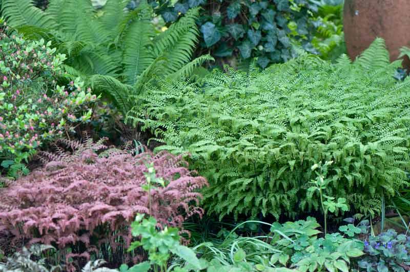 Eigentlich banal, aber trotzdem immer wieder schön: der Becher- oder Trichterfarn (mit Brunnera und Geum, vor Rhodos):