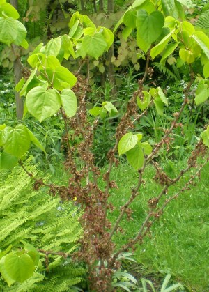"Forest Pansy" ist ohnehin eine Prinzessin auf der Erbse.Das Zweigesterben soll eine seiner Charaktereigenschaften sein. Auch meiner hat erneut tote Zweigeenden, was nicht gerade zur Zierde gereicht.Aber er ist belaubt tatsächlich ein Hingucker.