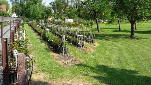 Hinter dem Kletterrosenweg ist auch eine Wiese mit Hochstämmen, die sahen sehr durchwachsen aus, von halbtot über mickrig bis ganz vital alles vertreten.