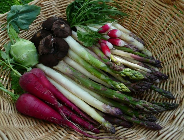 Radischen, Eiszapfen, Feldsalat, Spinat, Schnittsalat, Kopfsalat, Melde, Knoblauchrauke, Brunnenkresse, Kräuter (Schnittsellerie, -knoblauch, -lauch, Petersilie, Wurzelpetersilie, Dill, Estragon, Ysop, Liebstöckel, etwas Olivenkraut, Zitronenthymian, verschiedene Minzen, Winterheckzwiebel), einige Blumen für die Vase und vereinzelte Stängel vom Rhabarber und 2 Grünspargel.Dazu noch gebleichten Löwenzahn, Löwenzahnknospen und MeerrettichblätterLGTaques
