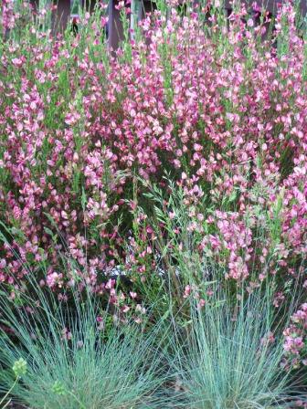 Derzeit blüht Festuca glauca (oder cinerea?), hier vor einem Elfenbeinginster: