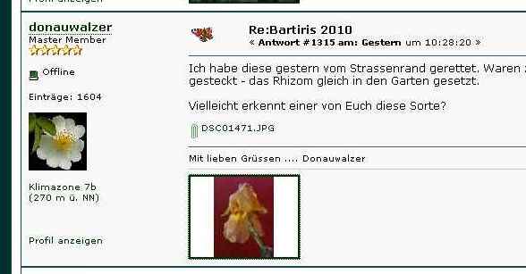 Ich hab heuer leider sehr wenig zeit für Gartenpur.Deshalb hier im Schnelldurchgang.Liebe Irisfool ich sehe meine "Iris-kinderchen" mach mir Ehre und blühen bei dir.Die Namen bei den Posts sind alle richtig, deine Zweifel unberechtigt.Von den Iris die ich letztes Jahr von verschiedenen Forumsmitgliedern bekommem habe blühen heuer auch die meisten. Zeit zum posten werde ich aber erst im Herbst/Winter finden. Ich hab den Thread überflogen und folgende Bilder mit Namen oder Namensvorschlägen versehen. Wer näheres wissen möchte sendet mir am besten eine PM. (und hat Geduld bis Herbst)Lg Irishans