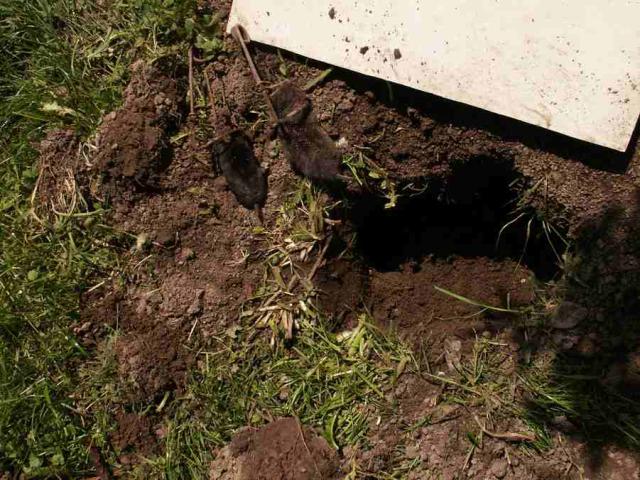 Letzen Sommer hatte sich ein Maulwurf bei uns breit gemacht. Da es an Engerlingen bei uns nicht fehlt, kam der gerade recht.Bis zum Wintereinbruch gabs immer wieder neue Hügel, seither keinen mehr. So nahm ich an, daß der wohl den Geist aufgegeben hatte.Nun ließen leider einige Tulpen die Köpfe hängen und die Zwiebel war weg. Da es, wie gesagt, an der Hügelfront nicht neues gab nahm ich eine Wühlmaus in den Maulwurfgängen an. Also Fallen rein. Es dauerte nicht lange, dann hatte ich die Erste, eine ganz dicke. Da der Gang trotzdem gleich wieder zugeschoben wurde, war klar dass die nicht allein war.Zwei Tage später hatte ich dann wieder Erfolg:Auf der einen Seite war die Wühlmaus in der Falle, auf der Anderen leider ein Maulwurf.Womit auch wiederlegt ist, daß in belebten Maulwurfgängen keine Wühlmäuse sind.
