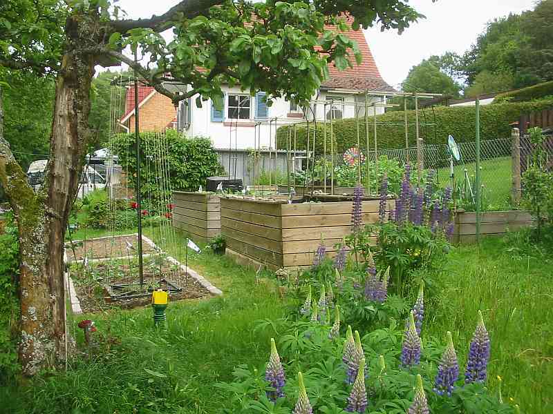 ! Und du hast deine Bohnen auch gerade erst gelegt, da bin ich beruhigt, ich bin nämlich auch beim Gemüsegarten mit einigem ewig im Rückstand, habs einfach zeitlich nicht geschafft, weil es hier noch so lange so kalt war und im Rest des Gartens auch noch so viel zu tun war.So sieht der Teil des Gartens mit den Gemüse-Kisten dieses Jahr von oben aus:Das Speisfass steht noch da, bei den beiden flachen Beeten hab ich erst vorgestern die Plastik-Umrandung weggerissen und statt dessen Randsteine gegossen, ist aber noch nicht ganz fertig (ich muss noch zwei Sack Beton besorgen).