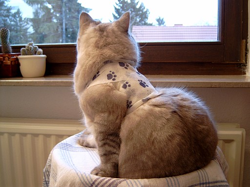 Ach ja, die Fellnasen wissen einfach nicht, wann man aufhören muss. Vor 3 Jahren sah mein Tobykater 5 Wochen lang so aus, nachdem er sich bis auf's Fleisch aufgekratzt hatte. Ich musste damals alle 2-3 Tage mit ihm zur TÄ, um die Wunde behandeln und den Verband wechseln zu lassen. Diese dumme Nuss