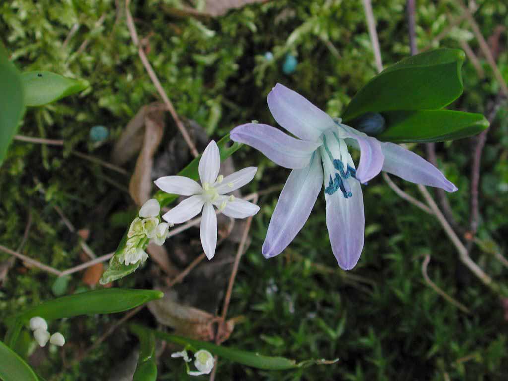 Guten Morgen,heuer nur ein Bild: Scilla bifolia Alba und Scilla rosenii. Die Scilla rosenii ist noch nicht nach unten gedreht und voll geöffnet, aber man sieht, um wieviel größer sie ist als die bifolia (bei der übrigens vor ein paar Tagen eine dieser fraßschädigenden Schleimer drübergegangen ist