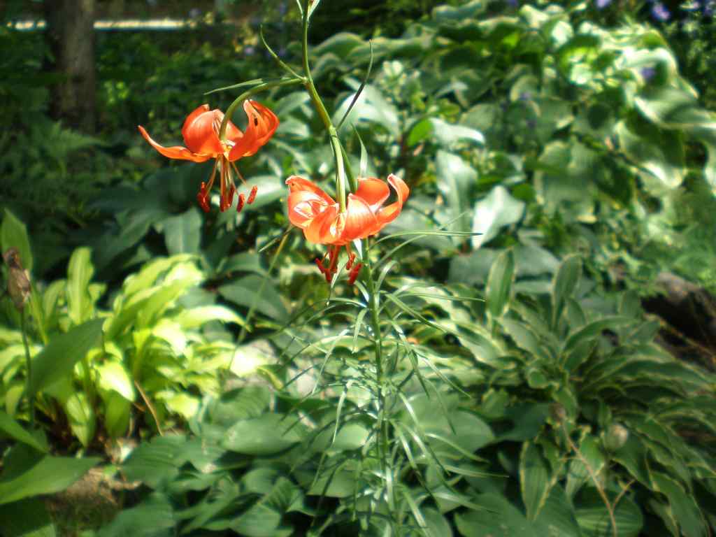 für darena die blüten. diese lilien sind gesund. ich habe die blüten genau kontrolliert, keine flecken. (von diesen kriegst du die bulbillen).links unten die flecken auf dem blütenblatt sind nur sonnenstrahlen, die durch`s blätterdach scheinen.