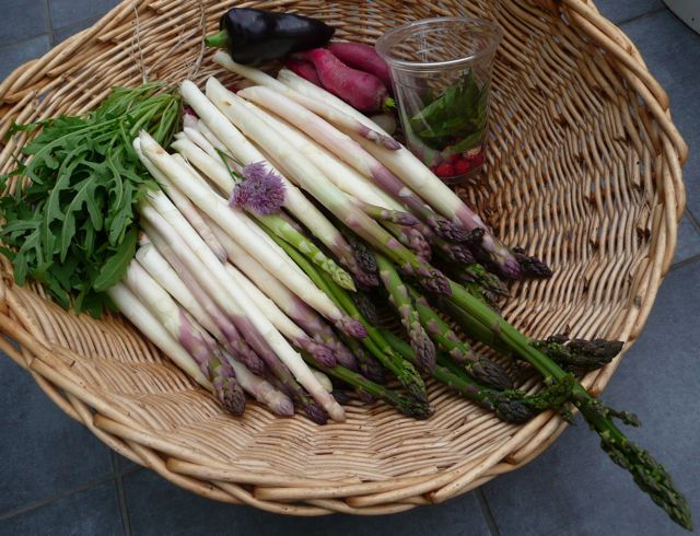 Spargel, Rucola, Rettiche, ein paar Walderdbeeren, ein bisschen Minze und die erste Paprika (von einer im Topf überwinterten Pflanze).