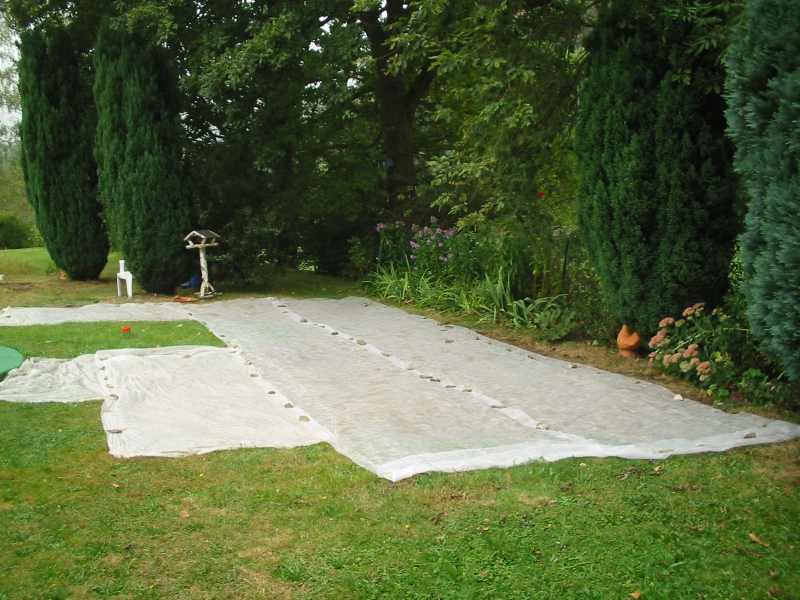 Dann hab ich neu eingesät und Vlies übergelegt, damit die Vögel nicht weiterscharren und auch nicht die Grassaat wegpicken.