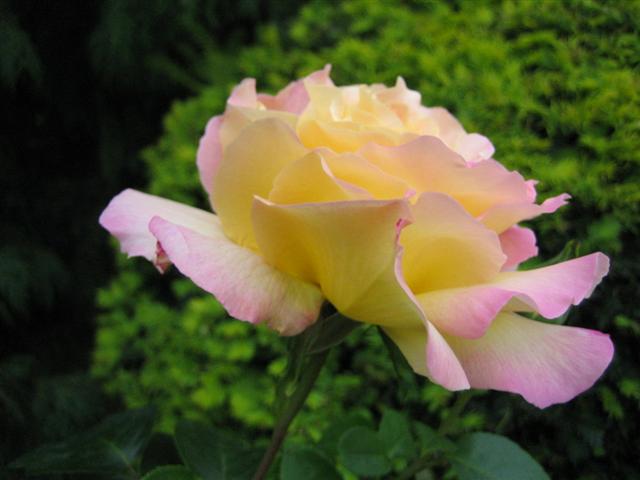 "Und sie umschmeichelte die Rose Peace mit ihrer ungleich besonderen Farbkombination in zartrosa/ mimosenbleichem gelb"....... grrrrrr!