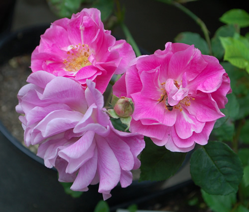 . Einmal die Farbe - rosa im gelbapricot Beet. Und die Annahme, dass sie mir über die Mauer hängen wird. Fehlgeschlagen. Es ist eine ganz aufrechte, etwas starre Rose, die sich auch kein bischen mit Runterbiegen aus ihrer aufrechten Haltung abbringen lässt.Davon abgesehen, eine sehr nette Rose.