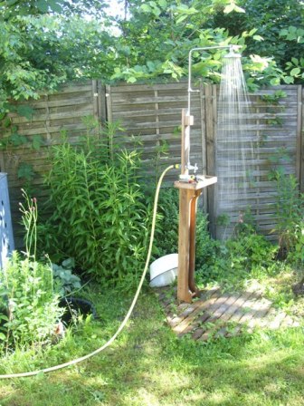 Ich bin ein großer Fan vom Gartenduschen - da bleibt das Bad schön unbespritzt.Angefangen habe ich 1998 mit einer normalen Gar...a Gartendusche, die auch an's Heißwasser angeschlossen war, weil wir noch kein Bad hatten. Geduscht wurde bis November 1998 draußen.Dann die "normale" Gar....a-Duschvariante, Holzpalette zum Ablaufen davor. Gartenschlauch...Seit dem letzten Jahr eine Teak-Holz-Dusche, komplett mit Bodenplatte, Seifenablage und so nem vercromten Duschdingens dran. Steht direkt am Hintereingang vom Haus, Foto kommt später, so, dass keiner die Ecke einsehen kann - daher kann ich auf eine Duschabtrennung locker verzichten - es sei denn es kommt jemand unangekündigt hinters Haus - ist noch nie passiert
