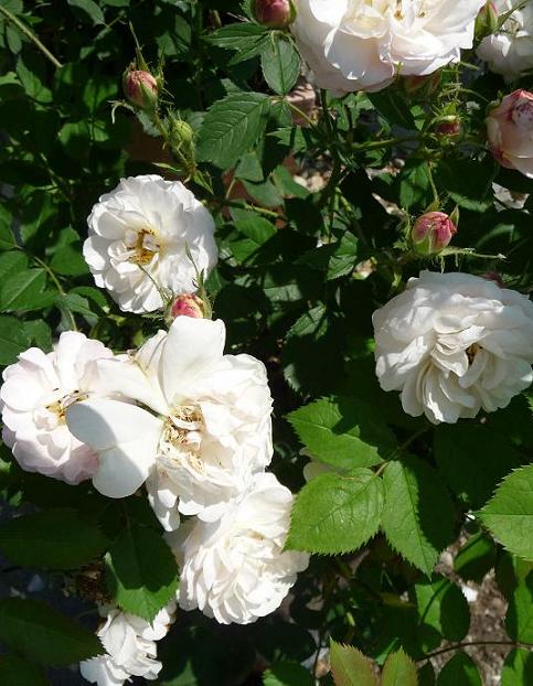 unten vorm Haus hat die Simstripe (Grimpant Brownie) mittlerweile ihre 3. Blüte geöffnet. Die erst wurde für Zuchtversuche unseres Kindes in Anspruch genommen (Honorine de Brabant war Pollenspender, das kann lustig werden, 2 verschieden gesprenkelte Kletterer!