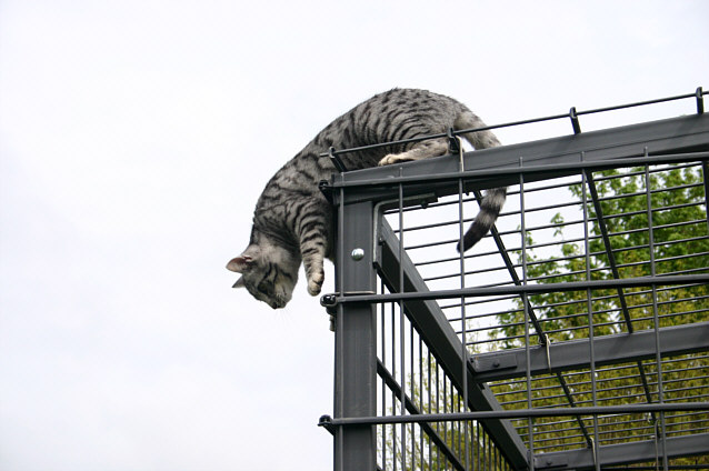 . Bei Barbara schlafen sie um die Wette, aber was passiert hier? Erst springt Baghira draußen auf eine Fensterbank, obwohl da Balkonkästen stehen, und schmeisst natürlich einen runter. Dann klettert sie gestern Abend mal wieder auf den Pavillon und von dort weiter auf den Wintergarten. Wir hätten nichts davon mitbekommen, wenn es nicht plötzlich heftig gerumpelt hätte: Madame ist durch ein Dachflächenfenster rein - und landete in der Beschattung darunter. Das war es dann wohl doch nicht und mit viel Mühe schaffte sie es wieder raus.Aber gute 6 kg Katze sind der Beschattung erst einmal gar nicht gut bekommen.