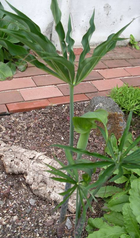 Ert vor wenigen Tagen aufgetaucht, dann aber plötzlich: Arisaema candidissima.Ich hatte sie im Herbst in Töpfe gesät und im Winter draussen ins Sandbeet versenkt.