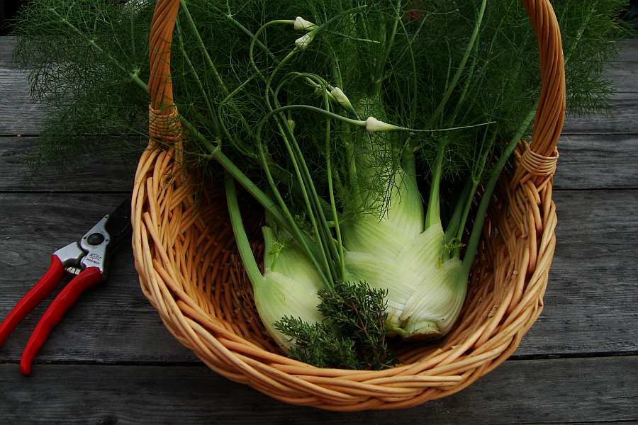 beneidenswert! :Dmeine schönen knollenfenchel schießen jetzt doch heftig und mussten dringend vom acker.ein wenig knoblauch und thymian kamen auch noch dazu.