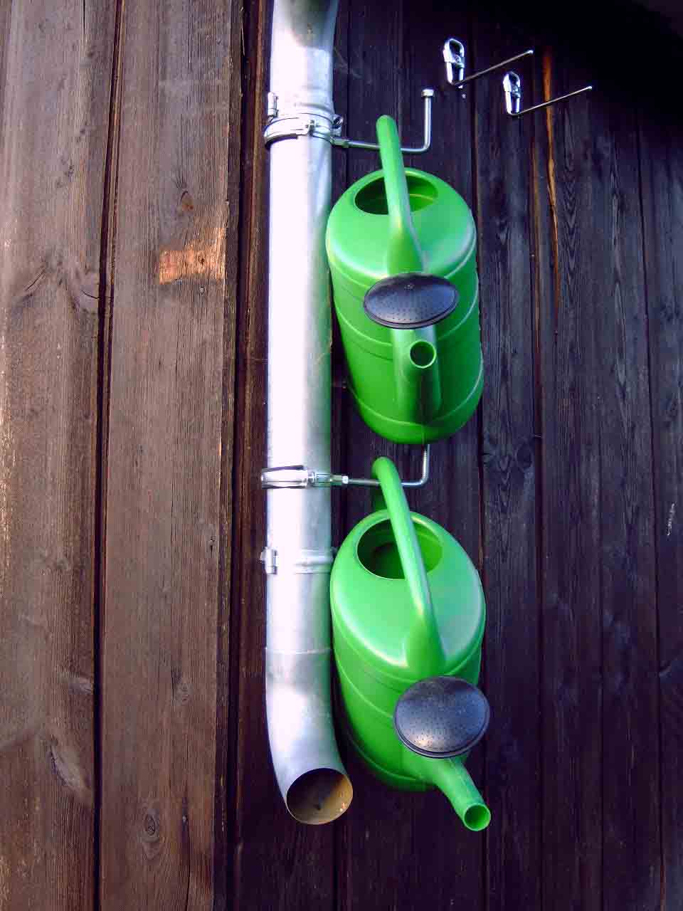 Meine Gießkannen sind stinknormal, aber vielleicht kann noch jemand meine Aufbewahrungsmethode gebrauchen:Aufhänger mit Rohrschellen und gebogenem Gewindestab am Fallrohr über der (hier nicht sichtbaren) Regentonne...