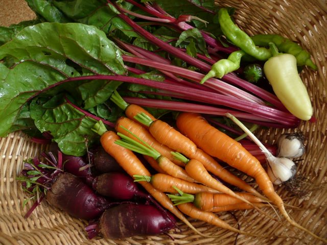 Stachelbeeren grüne und rote ( wird heute Abend Marmelade). Weisse Johannisbeeren, gelbe rote und schwarze Himbeeren, die letzten Erdbeeren. Mangold, brauner Krullsalat und einen total von Raupen maltretierten Chinakohl für die Hühner