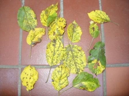 Hallo Gänselieschen,die dunklen Flecken auf den Blättern dürften mit ziemlicher Sicherheit Schorf sein. Die Vergilbung (zumindest wenn es die alten, ineren Blätter sind) dürfte Wassermangel sein.Gegen Schorf kannst du spritzen, wenn der Befall aber nicht schlimmer ist und vor Allem die Früchte nicht total braunfleckig sind (dann schmecken sie nicht mehr) würde ich es nicht unbedingt tun.Falls du spritzen willst:Im Frühjahr zum Austrieb gerne Kupfer, auch später einsetzbar, aber quietschtürkise Flecken...Danach kannst du einige Mittel einsetzen die du auch in Rosen einsetzen kannst wie Myclobutanil (z.B. Ectivo, Universal Pilzfrei M etc.) und Difenoconazol (Duaxo). Dabei ist es relativ egal ob du das Duaxo-Rosenpilzfrei oder "normale" hast, die Suppe ist die selbe und die Zulassungen auch. Für Myclobutanil von Bayer gilt das gleiche, auch hier gibt es das identische Mittel in unterschiedlichen Verpackungen.Aber Achtung! (wir hatten glaube ich mal das Vergügen bei den Rosen) Du darfst niemals ein Fungizid mit dem Wirkstoff Azoxystrobin auf Kernobst ausbrigen! Es gibt Sorten, die mit sehr starken Blattschäden reagieren! Und Folicur hat im Obstbau keine Zulassung!Du musst übrigens nicht zwingend regelmäßig und vorbeugend spritzen. Gerade bei Obst würde ich erst anfangen (von ein bis zwei Kupferspritzungen im Frühjahr abgesehen), wenn du die ersten kleinen braunen Flecken siehst. Dann aber zwei Behandlungen im Abstand von 5 Tagen. Ansonsten nur wenn Temperaturen deutlich über 10° herrschen und die Blätter lange nass sind. Schorf ist viel leichter einzudämmen als Sternrußtau.Gaaaanz wichtig!!!!Immer wenn du Pflanzen mit PSM bearbeitest die du essen willst musst du unbedingt die Wartezeit einhalten die auf der Verpackung angegeben ist! Das ist die Zeit (in Tagen) die mindestens zwischen der letzten Behandlung und der Ernte vergehen muss.Liebe Grüße,DanielP.S.: Ich hoffe dieses Mal ist es auf Anhieb verständlich und ich habe mich nicht zu kompliziert ausgedrückt...