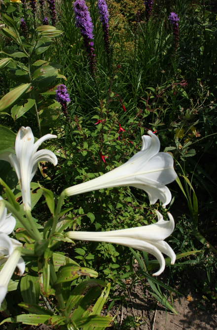 Immer wieder ein Wunder ist Helianthus orgyalis. Diese Pflanze bekommt ab dem Nachmittag volle Sonne, steht auf Sand, im Wurzeldruck von Sträuchern und Bäumen und ist trotzdem ca. anderthalb Meter hoch. Wo sie das Wasser zum wachsen herholt, ist mir ein Rätsel. Wer eine Solitärstaude auf einem sehr trockenen Beet braucht, sollte es mit Helianthus orgyalis versuchen.