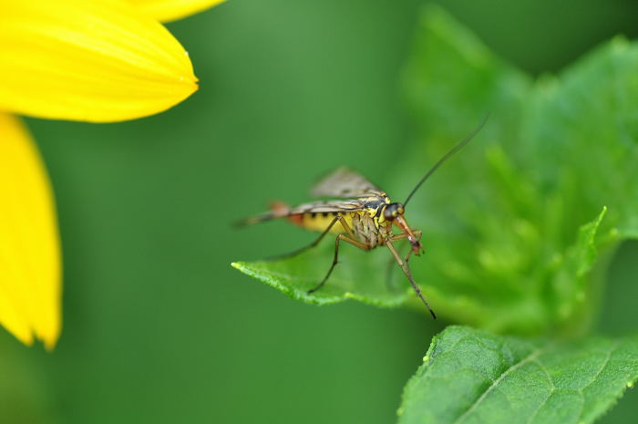 marygold,deine Skorpionsfliege ist ein Weibachen. Auch deine Hainschwebfliege ist weiblich.Bergfeige,Zum Thema Makrofotos von Insekten gibt es diverse Bücher und Internetseiten.Meine Erfahrungen sind folgende:Die besten Makrofotos gelingen morgens oder am späten Nachmittag. Dabei wird kein Blitz verwendet, um Reflektionen zu vermeiden. Ein Stativ ist förderlich, wenn nicht sogar zwingend, da längere Belichtungszeiten verwendet werden.Ich selbst gehöre nicht zu dieser Gruppe von Fotografen, zumal ich keinen Schönheitswettbewerb gewinnen will. Ich sammle per Foto Insektenarten und dokumentiere eine bestimmte Art. Mein Schwerpunkt sind dabei Grab- und Wegwespen. Nesteintrag für die späteren Larven findet aber in der Mittagszeit statt. Hier herrscht grelles Sonnenlicht. Das heißt ein Blitzlicht ist Pflicht, um die harten Schatten auszuleuchten. Ring- oder Zangenblitz ist hierbei von Vorteil. Um Bewegungsunschärfe zu vermeiden empfehle ich den Blitz auf 1/200 sec. einzustellen, Blende 8 bei Bewölkung, Blende 11 bei blauen Himmel.Als Objektiv 100mm von Canon oder 150mm von Sigma. Ein Stativ ist zum dokumentieren nicht erforderlich, eher hinderlich, da man innerhalb von Sekunden reagieren muß, um eine bestimmte Art, die man vielleicht nie wiedersieht, zu erwischen.Bei deiner Canon 400 D kannst du über die Individualeinstellungen den Blitz „fest aus 1/200 sec.“ einstellen. Modus: AV. Auch die genannten Objektive sind optimal für diese DSLR.Hoffe, du kannst mit diesen groben Hinweisen was anfangen.
